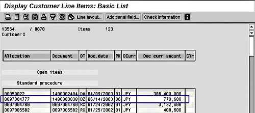 F-28. However, if you make an entry in the partial payment screen or residual item screen for a line item, you are not able to make an entry for the same line item in the other screen. To change the type of posting for a line item, you must double-click on it in the screen with an entry to close the value field, and then go to the other screen and double-click to display the other value field. Double-click on the amount field, not on the document information, as shown below. If you double-click on the document information, you will be taken to the line-item detail display.